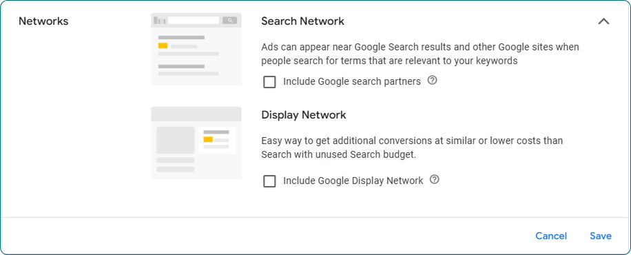 Campaign settings → Networks → Uncheck both boxes