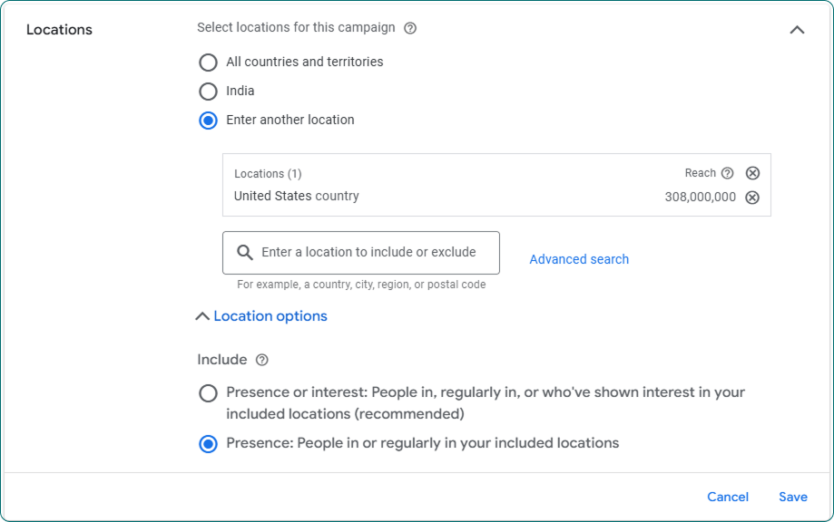 Location Options: pick Presence (people in location) not “Presence or Interest”. This setting hides two clicks deep; Google is cheeky like that. The default and recommended “Presence or Interest” quietly sprays ads at tourists and trivia buffs.